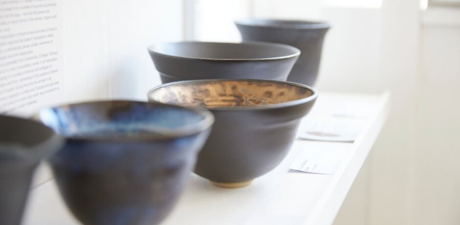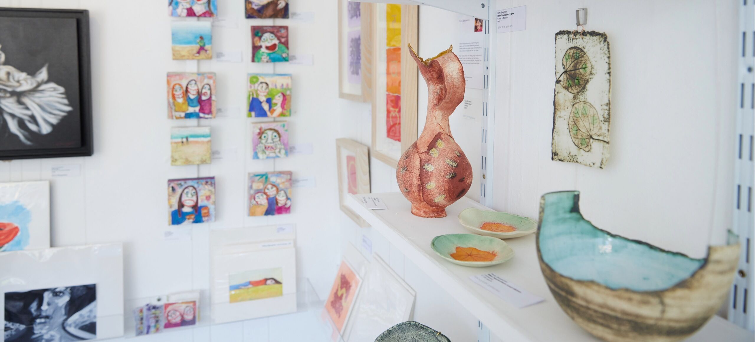 A white-walled gallery with shelves of ceramics and the walls hung with paintings