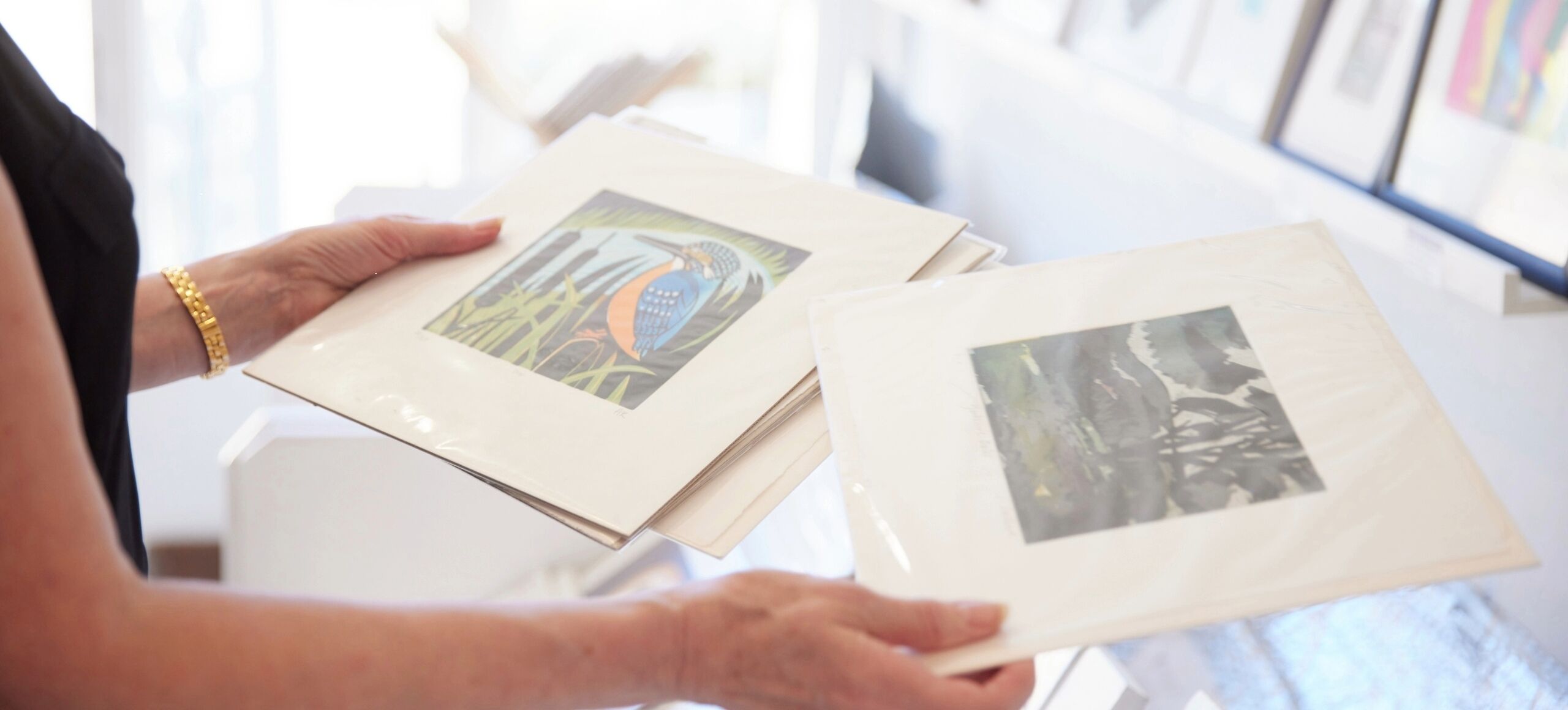 Two hands a pictured holding two artist prints